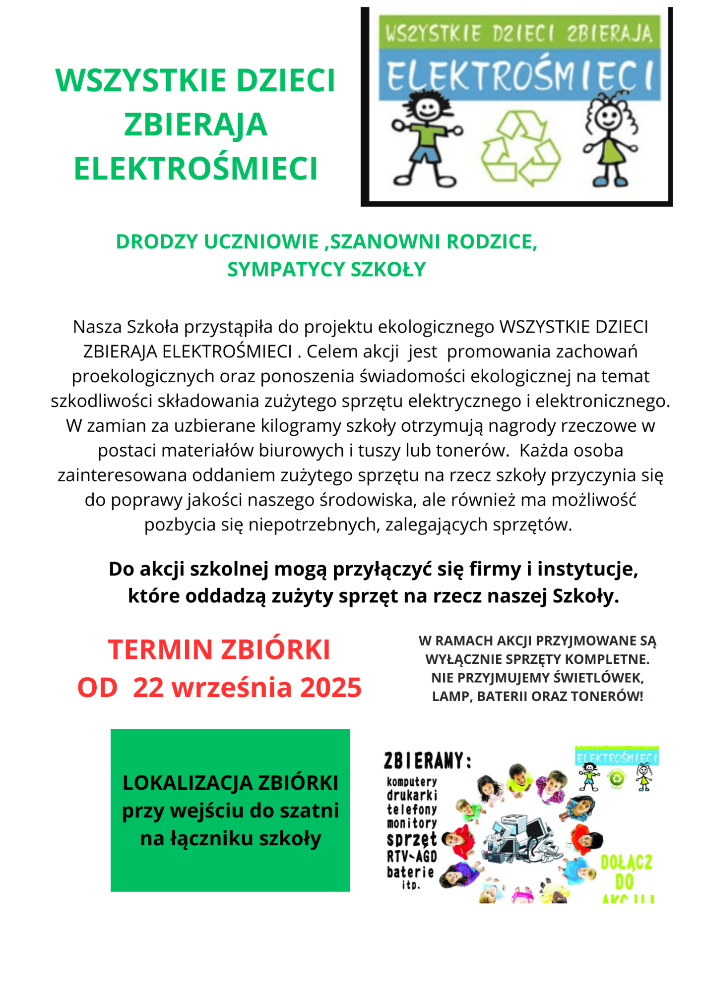 Nasza Szkoła przystąpiła do projektu: „WSZYSTKIE DZIECI ZBIERAJĄ ELEKTROŚMIECI”Celem akcji jest podniesienie świadomości ekologicznej wśród Dzieci i Młodzieży oraz zwrócenie uwagi na prawidłowe gospodarowanie odpadami. W zamian za przyniesiony zużyty sprzęt elektroniczny i elektryczny szkoła otrzyma bon, który wykorzysta na nagrody rzeczowe w postaci materiałów biurowych.